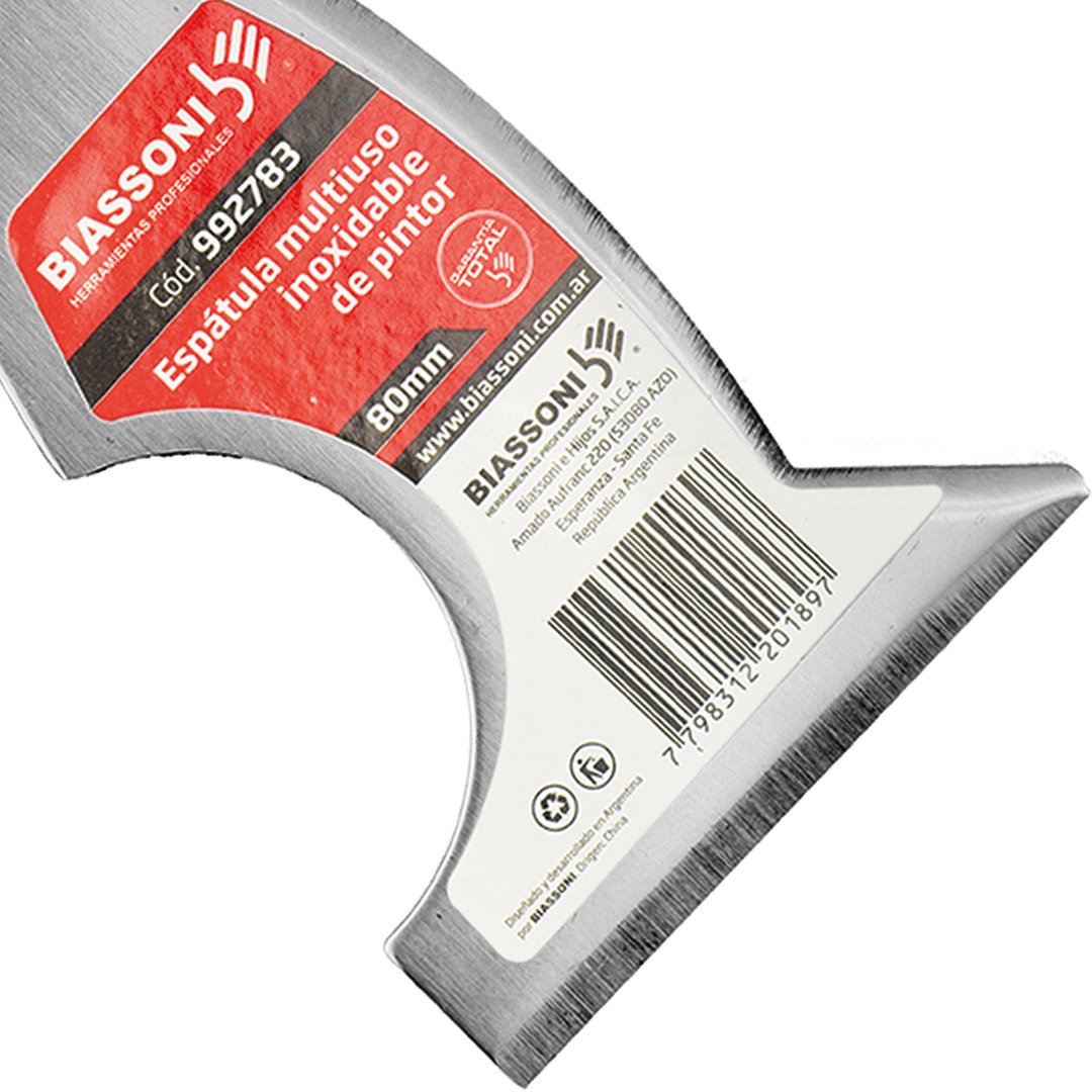 Espátula multiuso con 6 funciones. Hoja fabricada en acero inoxidable templada y pulida, espesor constante de 1,5mm, y mango bicomponente inyectado de polipropileno y TPR, antideslizante y con grip mejorado.
